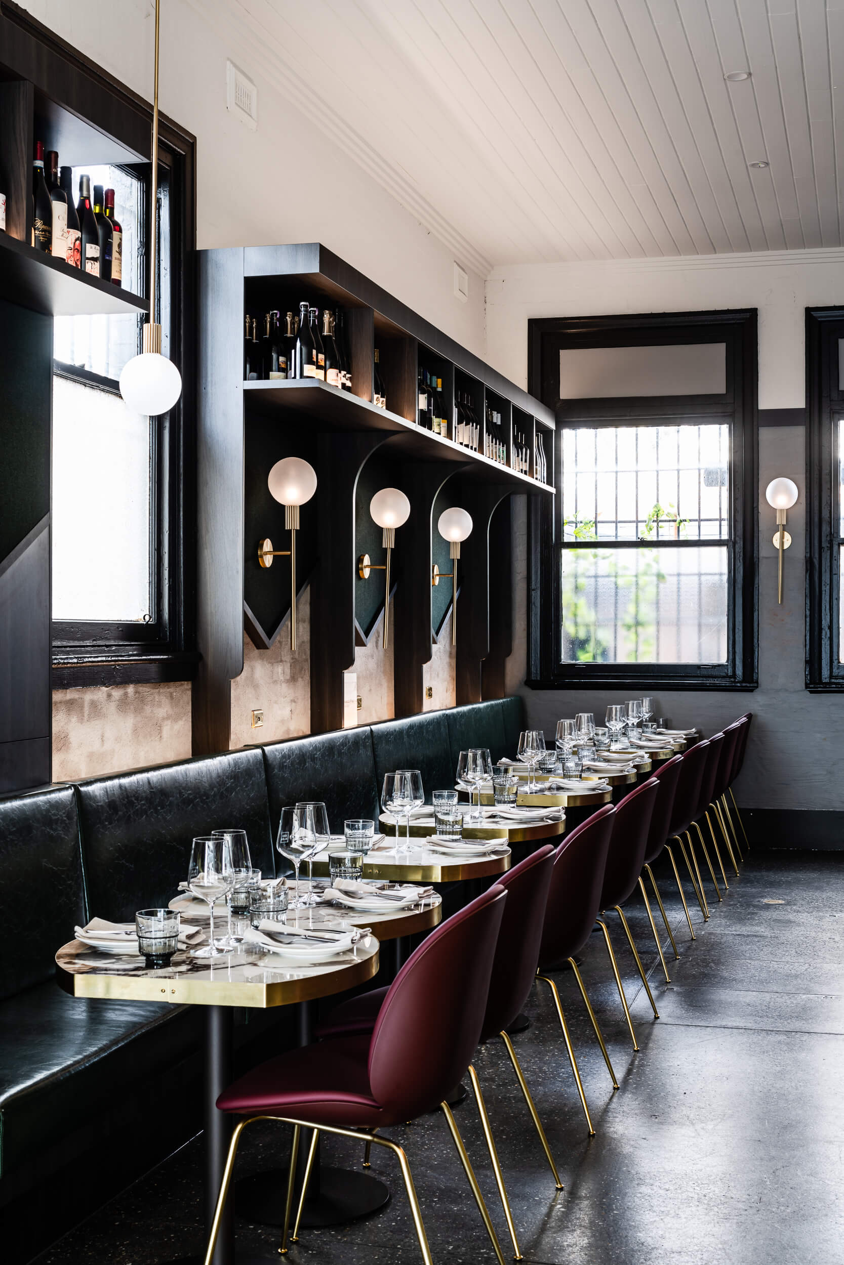 Interior Designers Buchan imagined the design of Bar Alba around the simple desire to celebrate great food and wine. With decorative copper framing features on the external windows, replicated by gold trimmings in the interior, metal inlays in the polished concrete floor and a centrepiece bar that stretches nine metres down the right-hand side of the narrow space. Blueprints delivers a boutique, intimate hospitality build that now exists as a bustling wine bar in the heart of Kew.